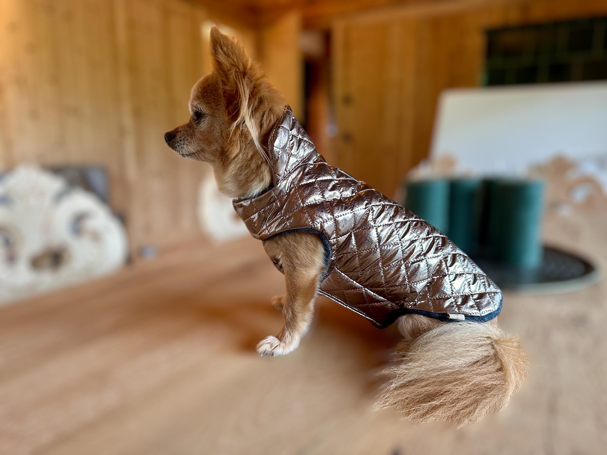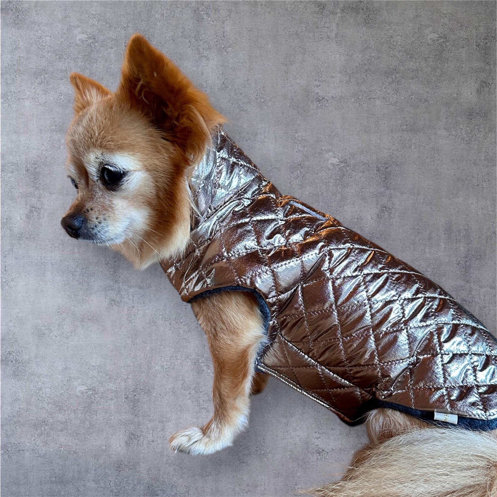 Shiny dog coat in black or metallic that keeps your dog cozy and warm.