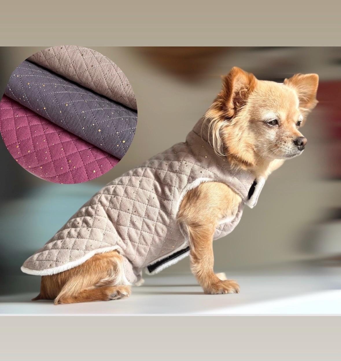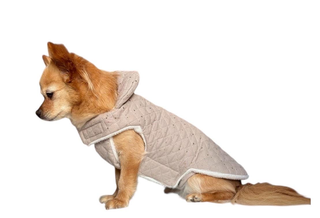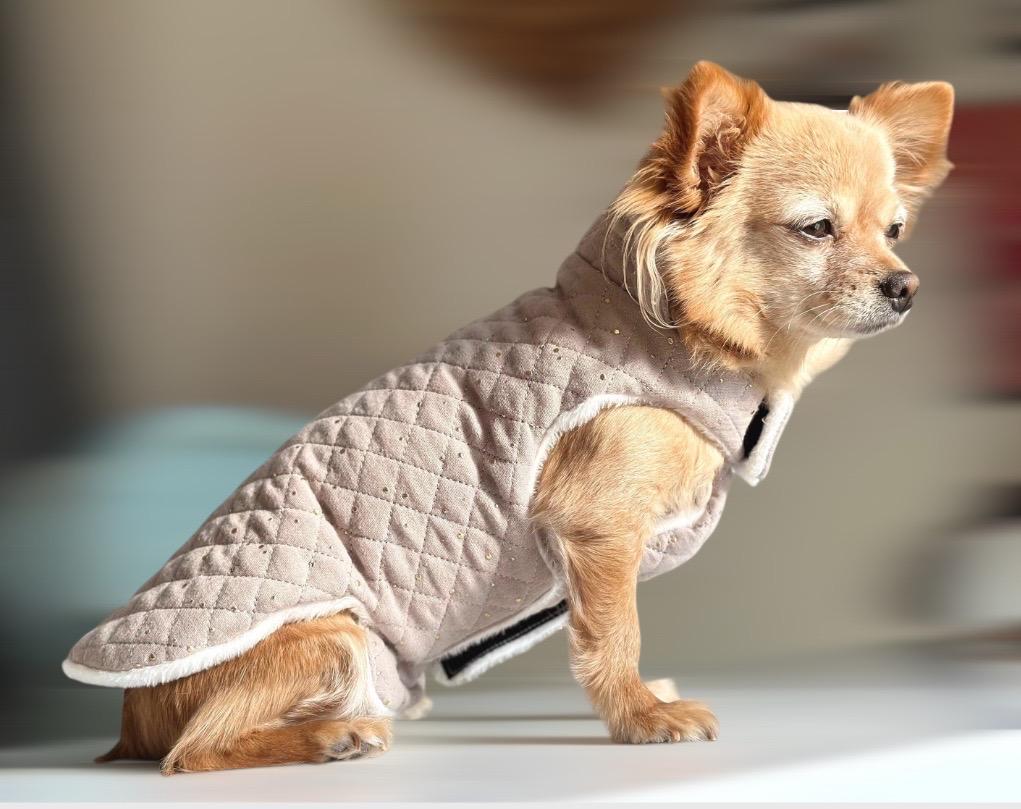 Muslin dog coat with gold speckles in various colors that will keep your dog cuddly and warm.
