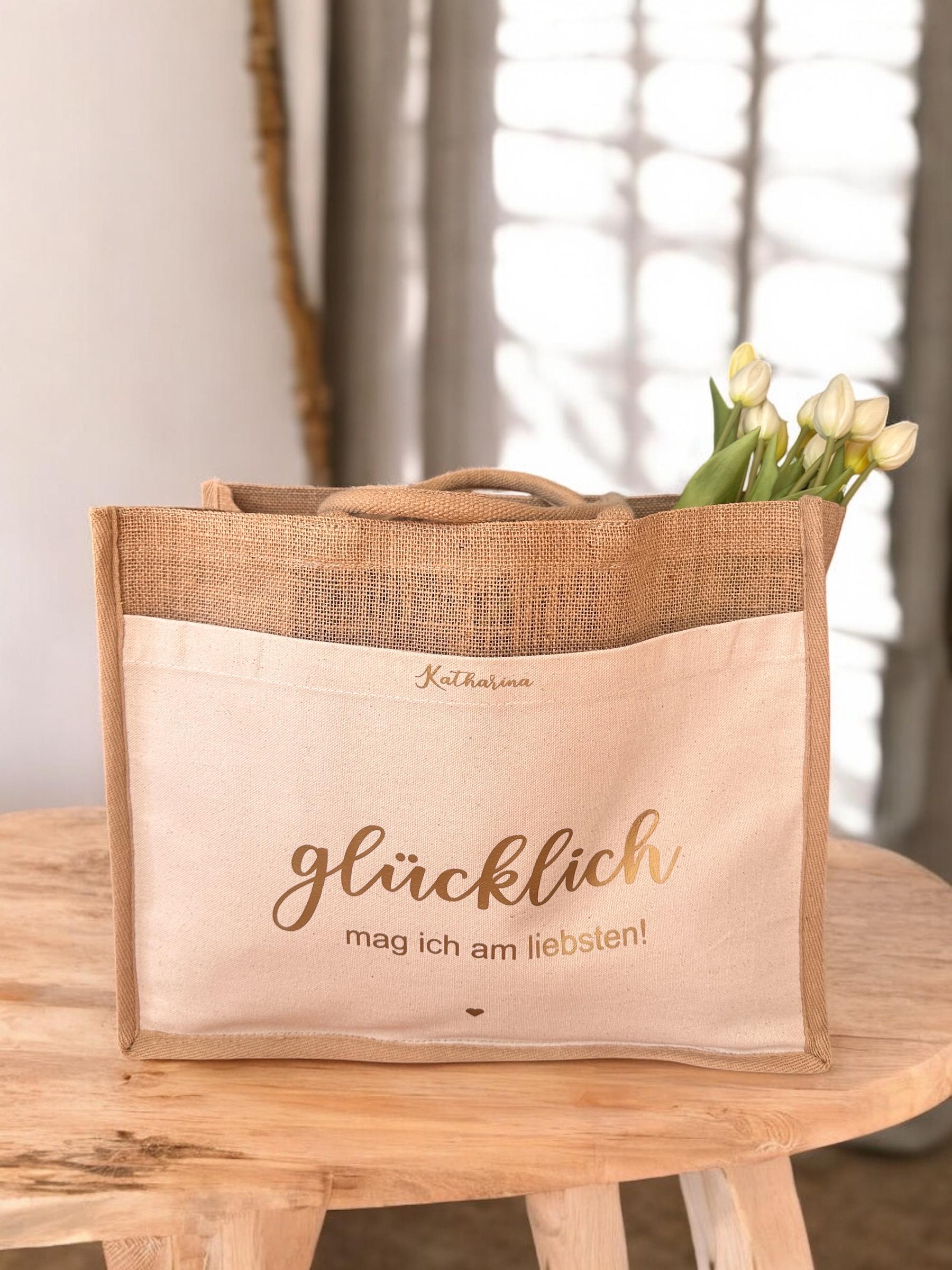 Our jute tote bag, made of sturdy jute and cotton, is lovingly personalized with a name and a heart. It's the perfect gift for a girlfriend, boyfriend, partner, sister, aunt, or mom.